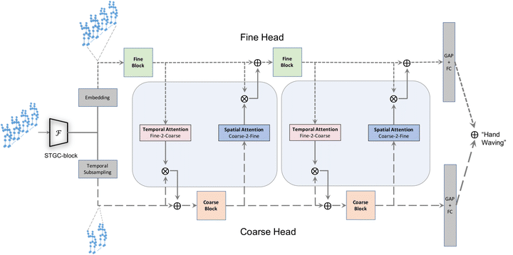 The task of skeleton-based action recognition remains a core challenge in human-centred scene understanding due to the multiple granularities and large variation in human motion. Existing approaches typically employ a single neural representation for different motion patterns, which has difficulty in capturing fine-grained action classes given limited training data. To address the aforementioned problems, we propose a novel multi-granular spatio-temporal graph network for skeleton-based action classification that jointly models the coarse- and fine-grained skeleton motion patterns. To this end, we develop a dual-head graph network consisting of two interleaved branches, which enables us to extract features at two spatio-temporal resolutions in an effective and efficient manner. Moreover, our network utilises a cross-head communication strategy to mutually enhance the representations of both heads. We conducted extensive experiments on three large-scale datasets, namely NTU RGB+D 60, NTU RGB+D 120, and Kinetics-Skeleton, and achieves the state-of-the-art performance on all the benchmarks, which validates the effectiveness of our method.