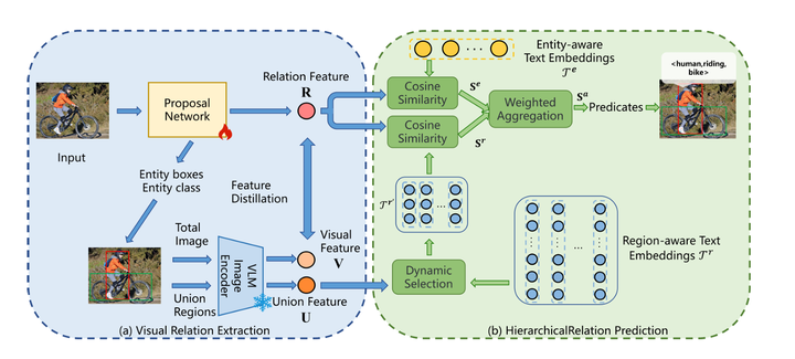 An overview of RAHP. (a) Visual Relation Extraction Module: The process begins with extracting relation proposals and their features from the image, which are then encoded into visual features using a VLM. (b) Hierarchical Relation Prediction Module: The visual features undergo a guided selection process, where the selected embeddings are combined with entity-aware embeddings to predict predicates.